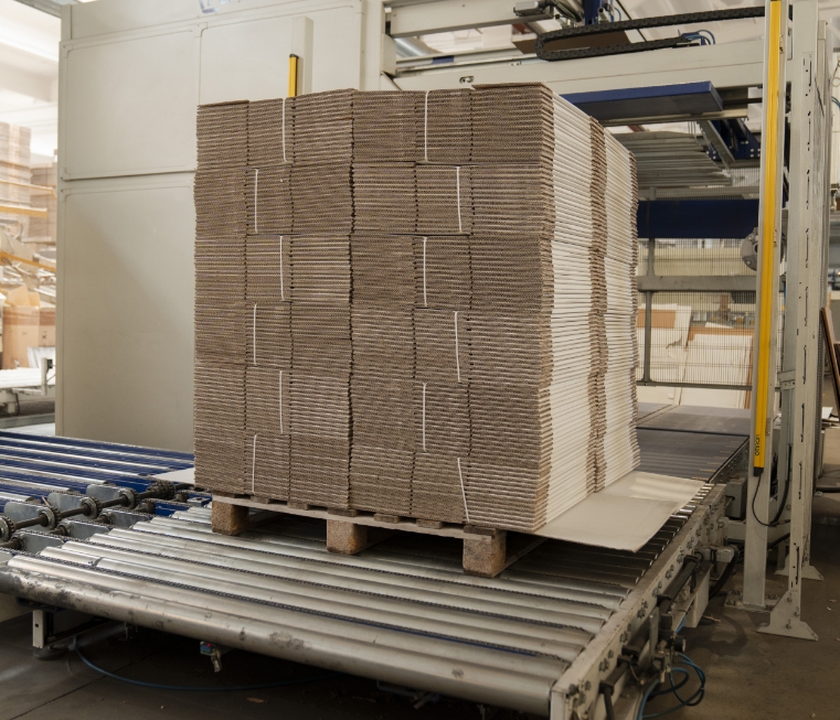 Le scatole prodotte vengono confezionate con reggette e successivamente palletizzate. Ogni bancale viene ulteriormente imballato, reggettato e firmato, garantendo la massima sicurezza durante il trasporto e la consegna. Il processo di carico, trasformazione e imballaggio è completamente automatizzato, garantendo elevati livelli di efficienza e precisione. Questa struttura organizzata ci permette di mantenere standard di qualità eccellenti e di rispettare le tempistiche di produzione e consegna, assicurando la massima soddisfazione dei nostri clienti.