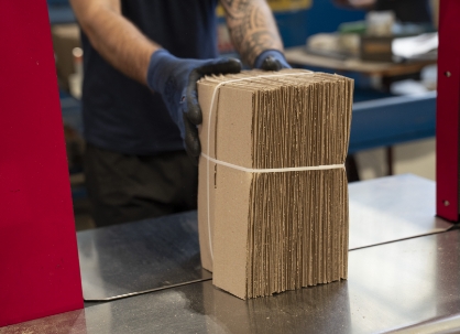 La fase di produzione comprende il taglio, la stampa e l’incollaggio delle scatole.